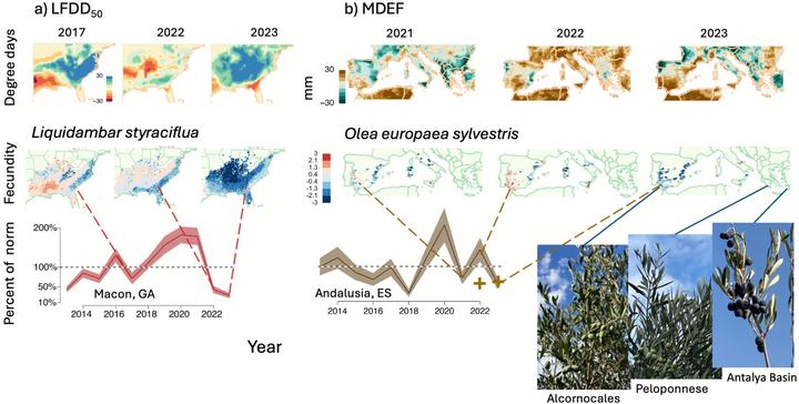 Anomalies associated with commercial losses compared with forests. Examples species show losses in late-freeze years (blue LFDD in a) and drought years (red, brown MDEF in b). Map colors saturate at 3SD of the mean on a log (proportionate) scale. Each dot on fecundity maps aggregates seed production (log kg/ha) from inventory plots (Methods). Shaded intervals in time series are 95% for annual crop averages with respect to the mean for both series. (a) Mapped anomalies for sweetgum (L. styraciflua) fecundity (center) track mapped LFDD anomalies for the strongest declines in peach-harvest years. (b) Wild olive (O. europaea sylvestris) maintains productivity in regions where commercial harvests were hard-hit by drought, with wild crops still above the norm in 2022. Commercial harvests in 2022/2023 are indicated by the plus sign (Ministerio de Agricultura 2024). Map shading is absent from Greece and Türkiye, which lack inventory data. Photos from three regions of commercial harvest failures show productive wild olive crops in 2023. Map lines delineate study areas and do not necessarily depict accepted national boundaries. [photos JSC]