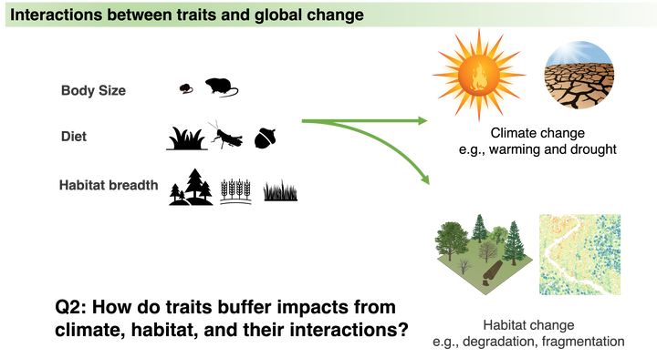 Tong’s abstract: Small mammals play crucial roles in ecosystem services and functions, including seed dispersal, pollination, and nutrient cycling. Their activities facilitate forest regeneration, enhance plant diversity, and contribute to soil fertility, indirectly supporting carbon sequestration and habitat provision. Current efforts to anticipate changes in small mammal populations incorporate various environmental variables but often overlook the fundamental requirement of food supply. The food-consumer relationship become even more complex when we consider the roles of ecosystem structure, which not only shapes the habitat, affecting the abundance, activity, and cover available to many consumers, but also act as buffers, mediating the impacts of climate change through climate-habitat interactions (CHI). Additionally, different traits such as habitat breadth, diet breath, body size, and fossoriality could determine species response to CHI. This study aims to answer two questions to fill these knowledge gaps: 1) How does habitat modulate climate change impacts on abundance of small mammals? 2) How do traits mitigate impacts from climate, habitat, and their interactions? We synthesized airborne hyperspectral and LiDAR remote sensing with biodiversity sampling of more than 60 species across NEON within a generalized joint attribute model. We found that habitat characteristics, including LiDAR-derived understory density and hyperspectral-derived canopy lignin, are significant sources of variation in both species’ abundance and community-weighted mean traits. The habitat-trait interactions revealed four major species groups. Grassland herbivores respond negatively to canopy lignin, particularly in cold climates. Shrubland frugivores benefit from open habitats in cold climates but not in warmer ones. Large-bodied granivores show decreased abundance with dense understory, and these negative effects are amplified by ECOSTRESS-derived moisture stress. Furthermore, the widely distributed species Peromyscus maniculatus is projected to decrease under future climate change scenarios, especially in closed canopies with high canopy lignin. Because ecosystem structure and canopy nutrients are under the control of managers, these results have direct implications for biodiversity conservation.